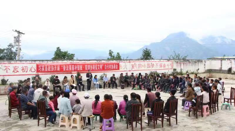 近日,巧家县政协副主席罗奎率队到茂租镇白卡村,开展“普法强基补短板·院坝协商促文明”协商议事活动。茂租镇政协委员、相关站所负责人、茂租镇挂村队员、白卡村两委干部、驻村工作队员、白卡村村民代表、群众代表共50余人参加协商议事会。