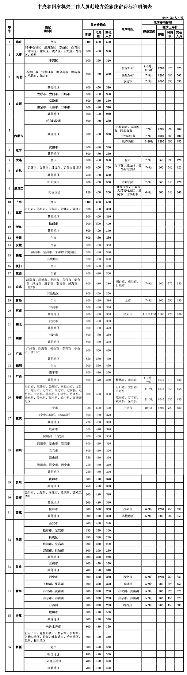 中国共产党新闻网北京4月15日电 (李源)财政部网站昨日发布“关于印发《中央和国家机关工作人员赴地方差旅住宿费标准明细表》的通知”。根据通知内容,中央和国家机关工作人员赴地方差旅住宿费标准细化到了地市,且根据职务级别对旺季时间和住宿价格给出了具体浮动标准。