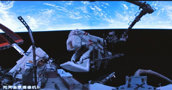 这是2025年6月26日在北京航天飞行控制中心屏幕上拍摄的神舟二十号航天员陈冬(左)与陈中瑞在空间站组合体舱外工作的画面。新华社发(周柯毅摄)