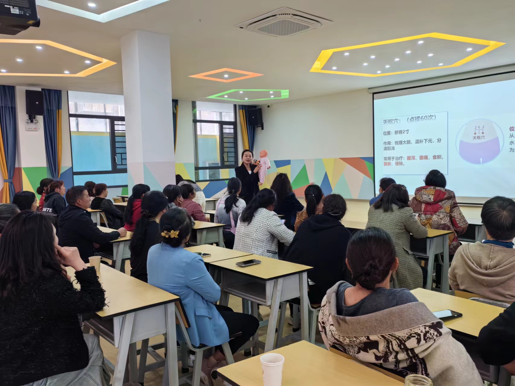 培训会上,讲师们围绕小儿推拿和护理的基本知识进行了深入浅出的讲解,同时还开展了实操培训演练,让保育员妈妈们能够亲身体验和实践。